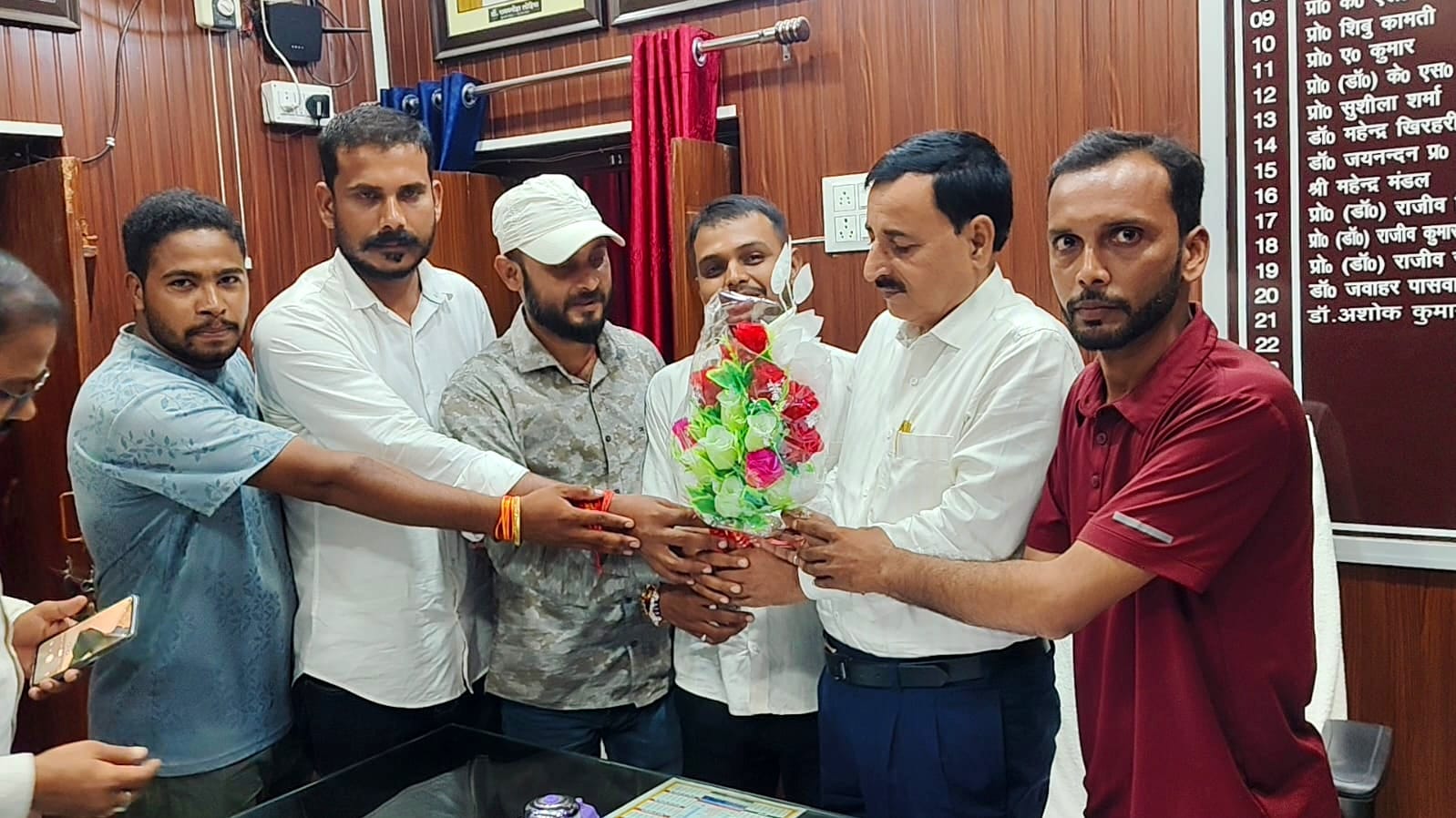 Madhepura:छात्र राजद के द्वारा के0 पी0 कॉलेज मुरलीगंज के नवनियुक्त प्रधानाचार्य डॉ0 अशोक कुमार झा को गुलदस्ता भेंट कर बधाई एवं शुभकामनाएं दिए,साथ ही कॉलेज के सभी मुद्दों को विस्तार पूर्वक संज्ञान में दिया इसको लेकर प्रधानाचार्य महोदय ने कहा सभी विषय पर संज्ञान लेके जल्द से जल्द समाधान किया जाएगा मौके पे छात्र राजद भूपेंद्र नारायण मंडल विश्वविद्यालय लालू नगर के विश्वविधालय अध्यक्ष श्री सोनू यादव,के0 पी0 कॉलेज मुरलीगंज के अध्यक्ष गौरव कुमार, भूपेंद्र नारायण मंडल विश्वविद्यालय के महासचिव प्रिंस यादव, निशिकांत कुमार, सुमित कुमार एवं अन्य छात्र मौजूद थे।